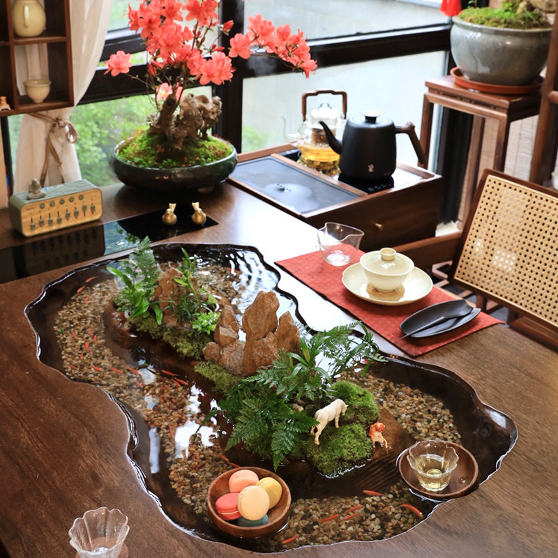 The Zen Garden Table is a unique and beautiful piece of furniture that is perfect for any home or office. The table is made of high-quality wood and features a glass top that reveals a miniature riverbed filled with water, moss, and stones. The riverbed is surrounded by a raised edge, creating a sense of depth and separation from the rest of the table.